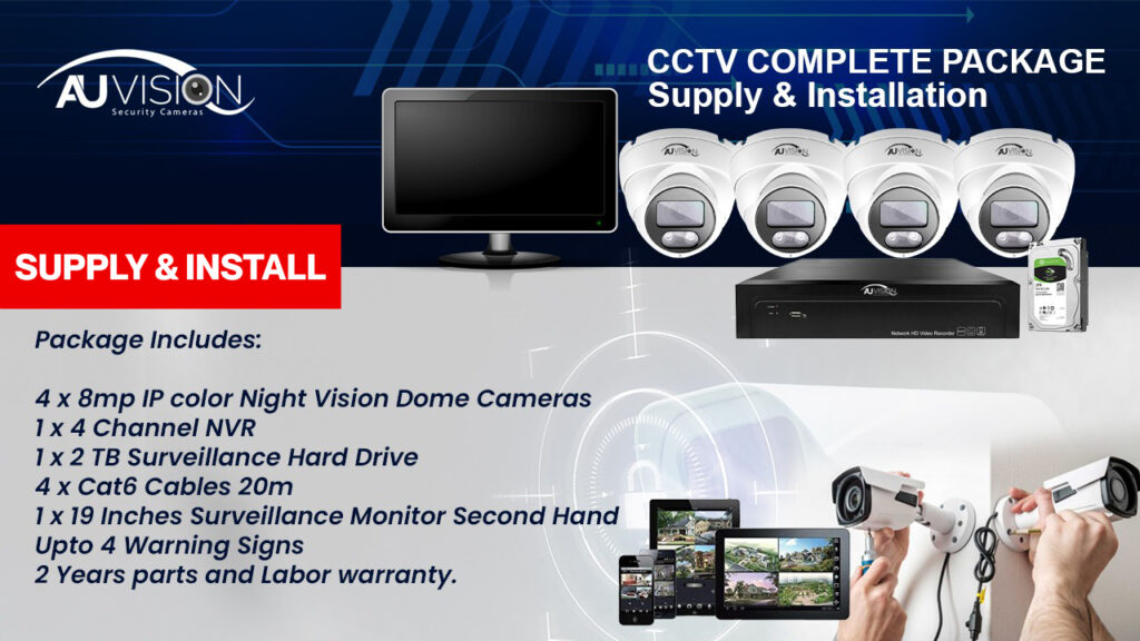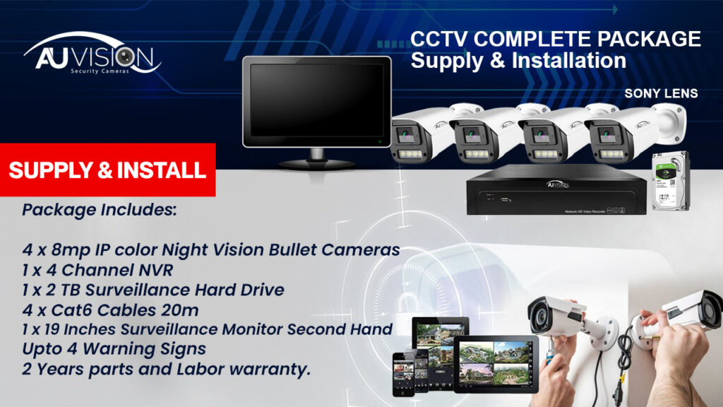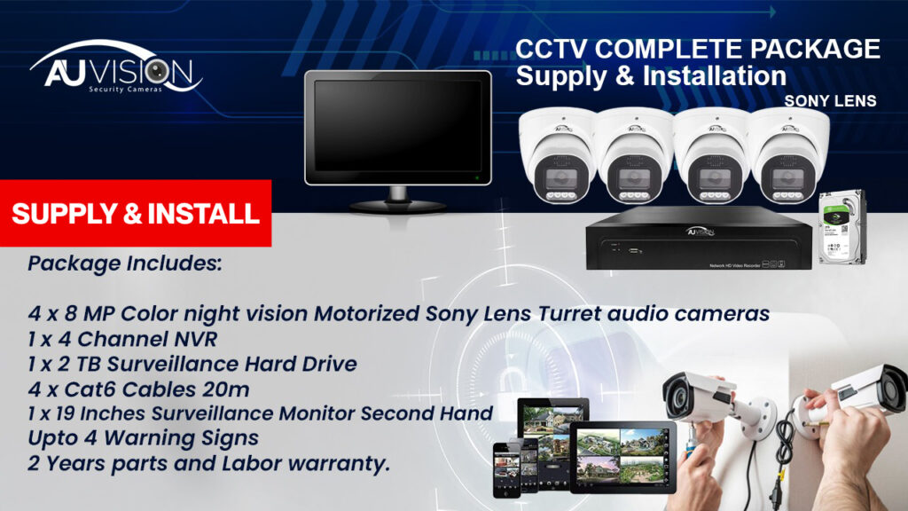 Supply and installation of 4 x AU Vision 8 MP IR Motorized Lens Color night vision focal Turret Network Camera 3.6 mm Lens